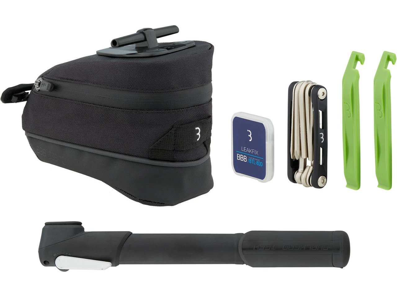 Lieferumfang:1 x Satteltasche BBB StorePack M BSB-12M1 x Minipumpe BBB WindWave BMP-541 x Multitool BBB MaxiFold S BTL-141S2 x Reifenheber BBB EasyLift BTL-811 x Reparaturset BBB LeakFix BTL-801 x Halterung für Minipumpe2 x Befestigungsschraube