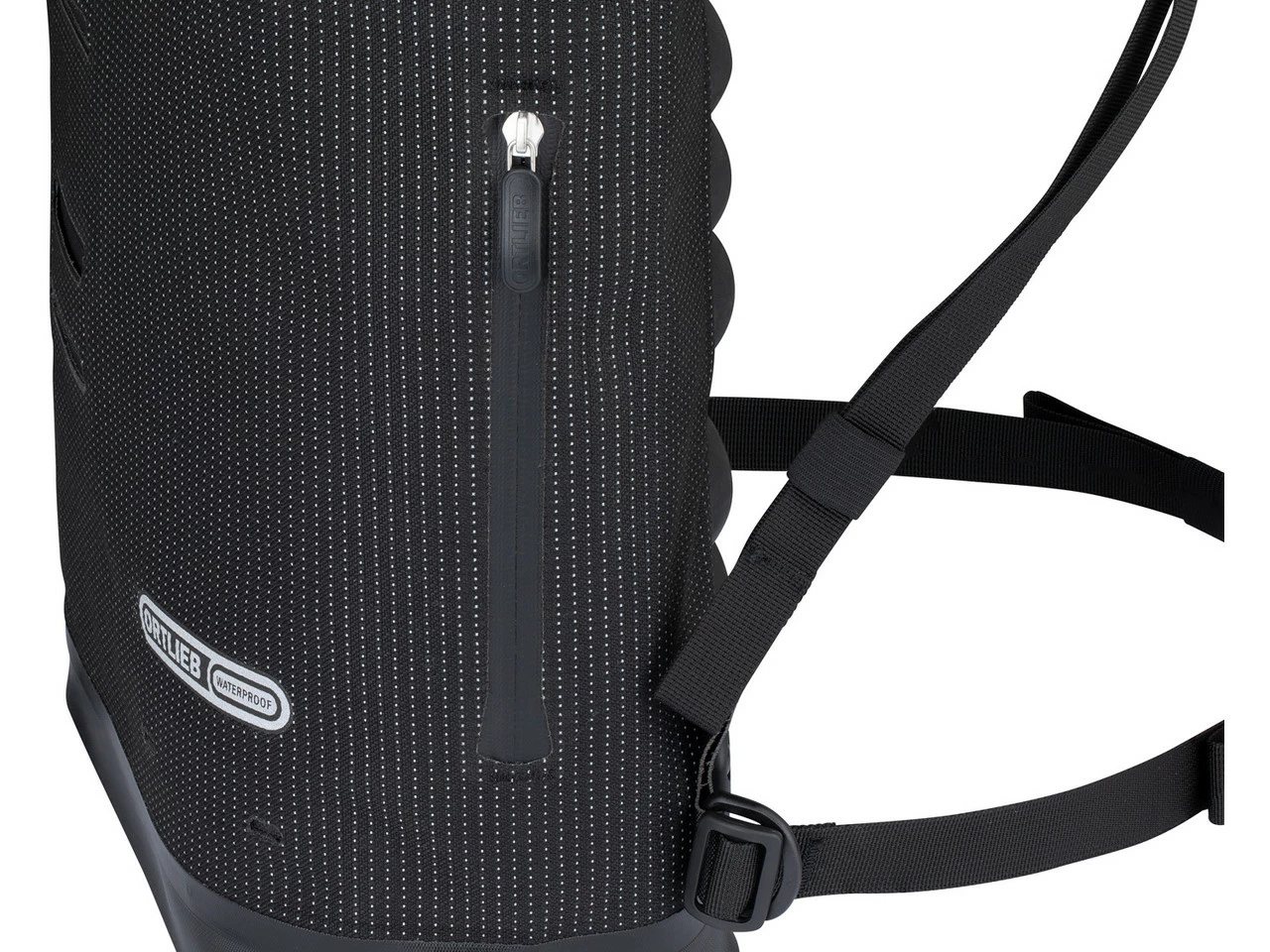 Der ORTLIEB Commuter-Daypack High Visibility Rucksack erhöht durch das eingewobene Reflexgarn Deine Sichtbarkeit im Straßenverkehr. Dieses reflektiert auftreffendes Licht und so wird der gesamte Rucksack zu einem Leuchtschirm, wenn ihn z. B. Autoscheinwerfer anstrahlen. Dabei bleibt er im Alltag unauffällig mit seinem urbanen Look. Durch die PU-Beschichtung hält er zudem zuverlässig wasserdicht. Dein Notebook ist in einem gepolsterten Extrafach gut aufgehoben. Ergonomische Schulterträger, ebenfalls mit Reflexgarn versehen, und das durchdachte TPU-Rückenpolster mit Lüftungskanälen liefern ein bequemes Tragegefühl. In der (nicht wasserdichten) Außentasche mit Reißverschluss kannst Du auf die Schnelle Deine Radbrille oder Deinen Schlüssel verstauen. Mit dem praktischen Rollverschluss und dem unempfindlichen, verstärkten Boden lässt der Commuter-Daypack High Visibility keine Wünsche an einen modernen Stadtrucksack offen.
