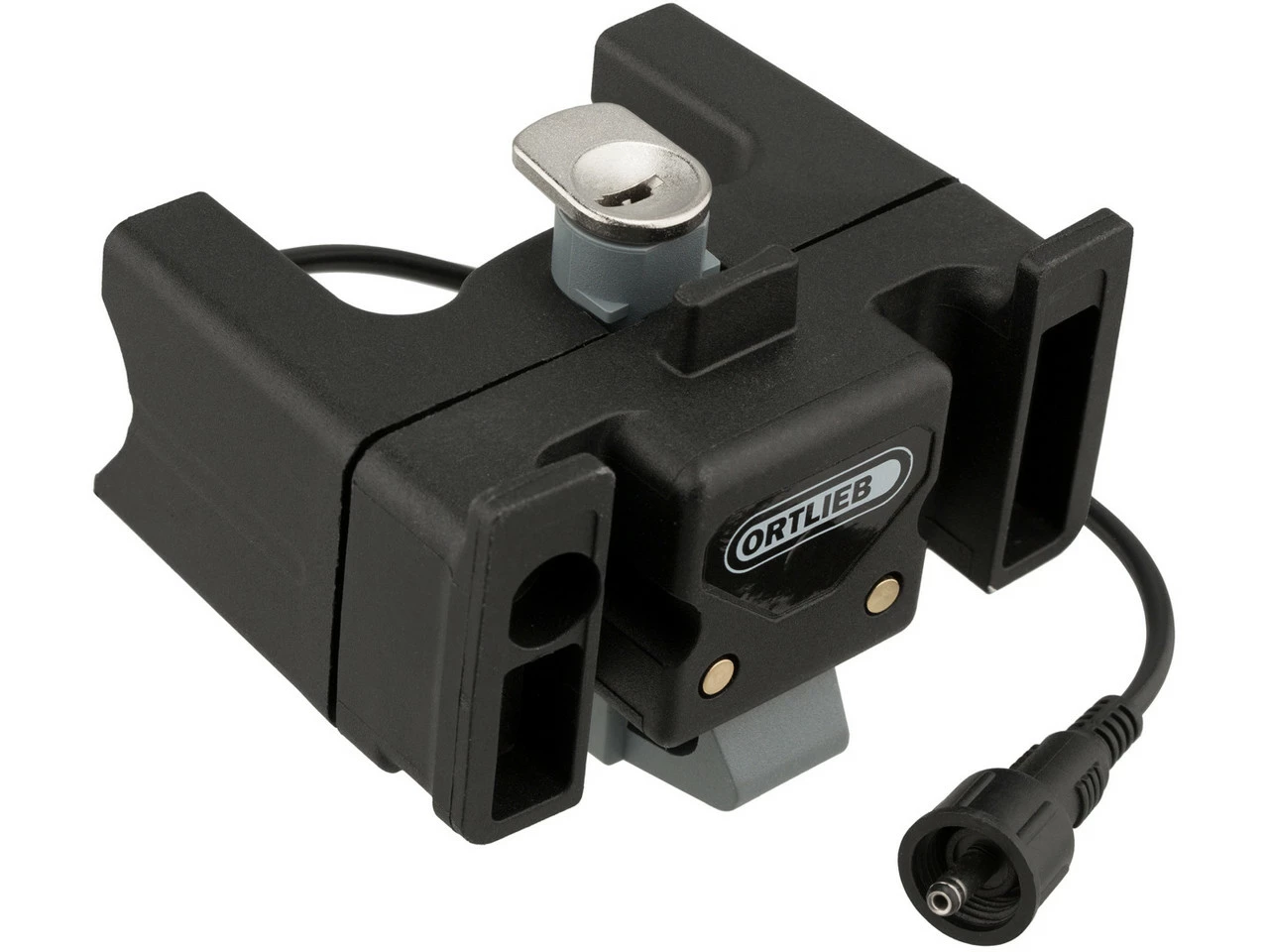 Abschließbarer Halterungsblock mit elektrischer Vorbereitung und zwei Kontaktpins zur Stromübertragung.