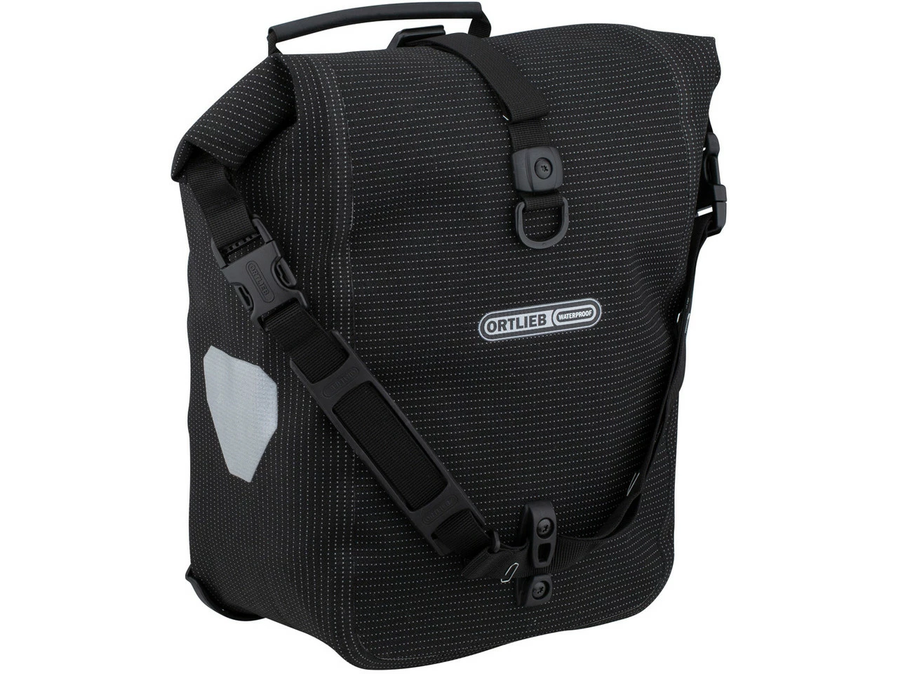 Mit den wasserdichten ORTLIEB Sport-Roller High Visibility Gepäckträgertaschen wirst Du auf Deinem City-Bike nicht übersehen. Das gesamte Gewebe ist vollständig mit einem reflektierenden Garn verarbeitet, das die Tasche bei einfallendem Scheinwerferlicht in einen großen Reflektor verwandelt. So kannst Du auch während der Dämmerung und bei Dunkelheit stets sichergehen, für andere Verkehrsteilnehmer gut sichtbar zu sein. Großflächige Reflektoren unterstützen die Sichtbarkeit dabei zusätzlich. Damit der Inhalt der Tasche optimal geschützt ist, ist sie mit einem Rollverschluss zum sicheren Verschließen ausgestattet. Mithilfe des Quick-Lock2.1-Adaptersystems befestigst Du die Taschen einzeln oder paarweise im Nu an Deinem Gepäckträger und nimmst sie genauso schnell wieder ab.