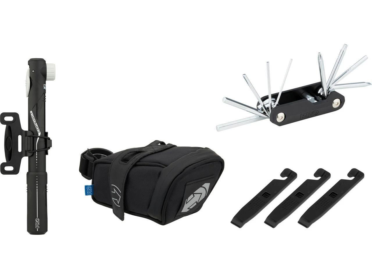 1 x Satteltasche PRO Medi1 x Minipumpe PRO Compact1 x Multitool PRO Minitool 103 x Reifenheber PRO1 x Rahmenhalterung für Minipumpe
