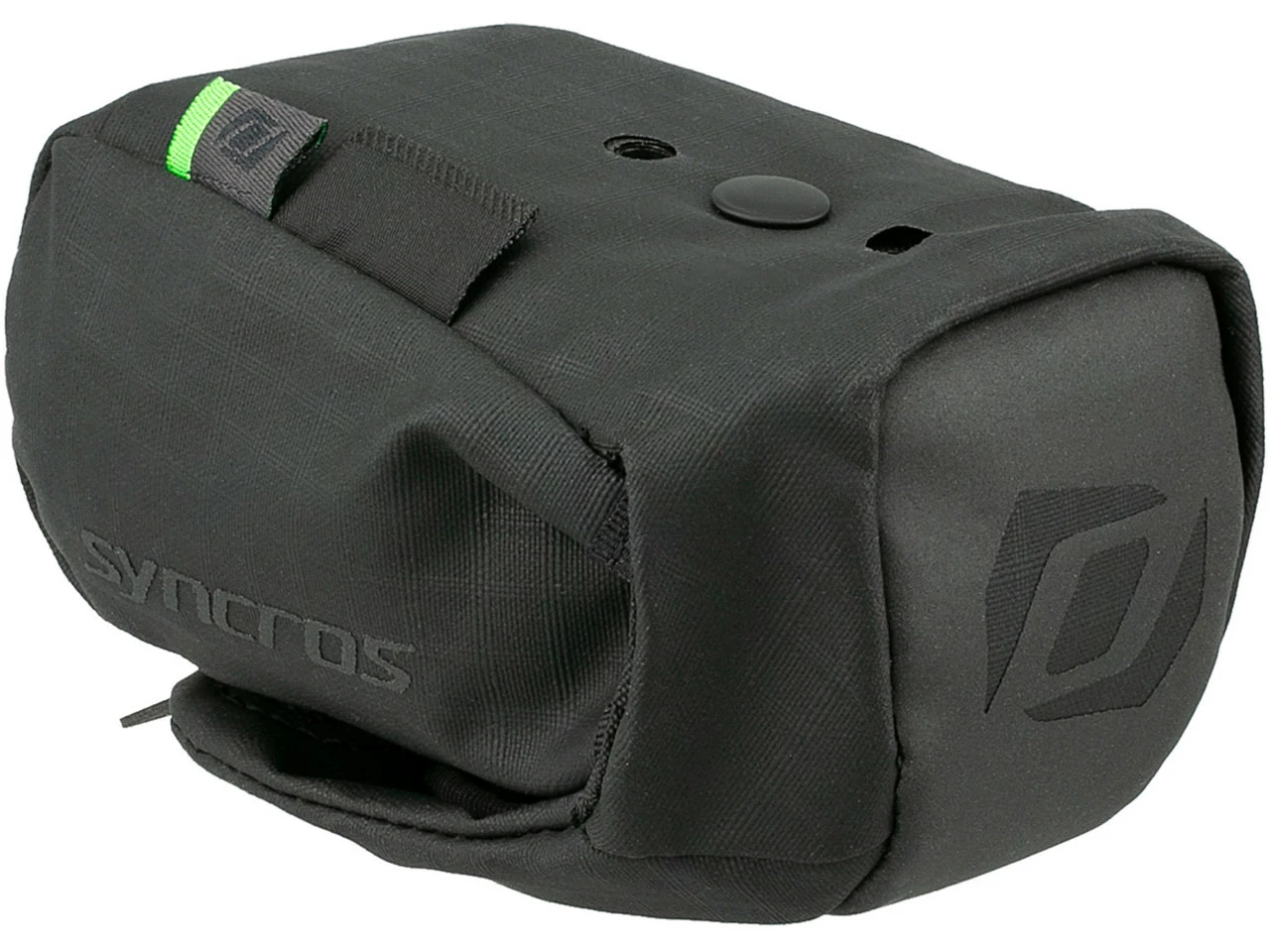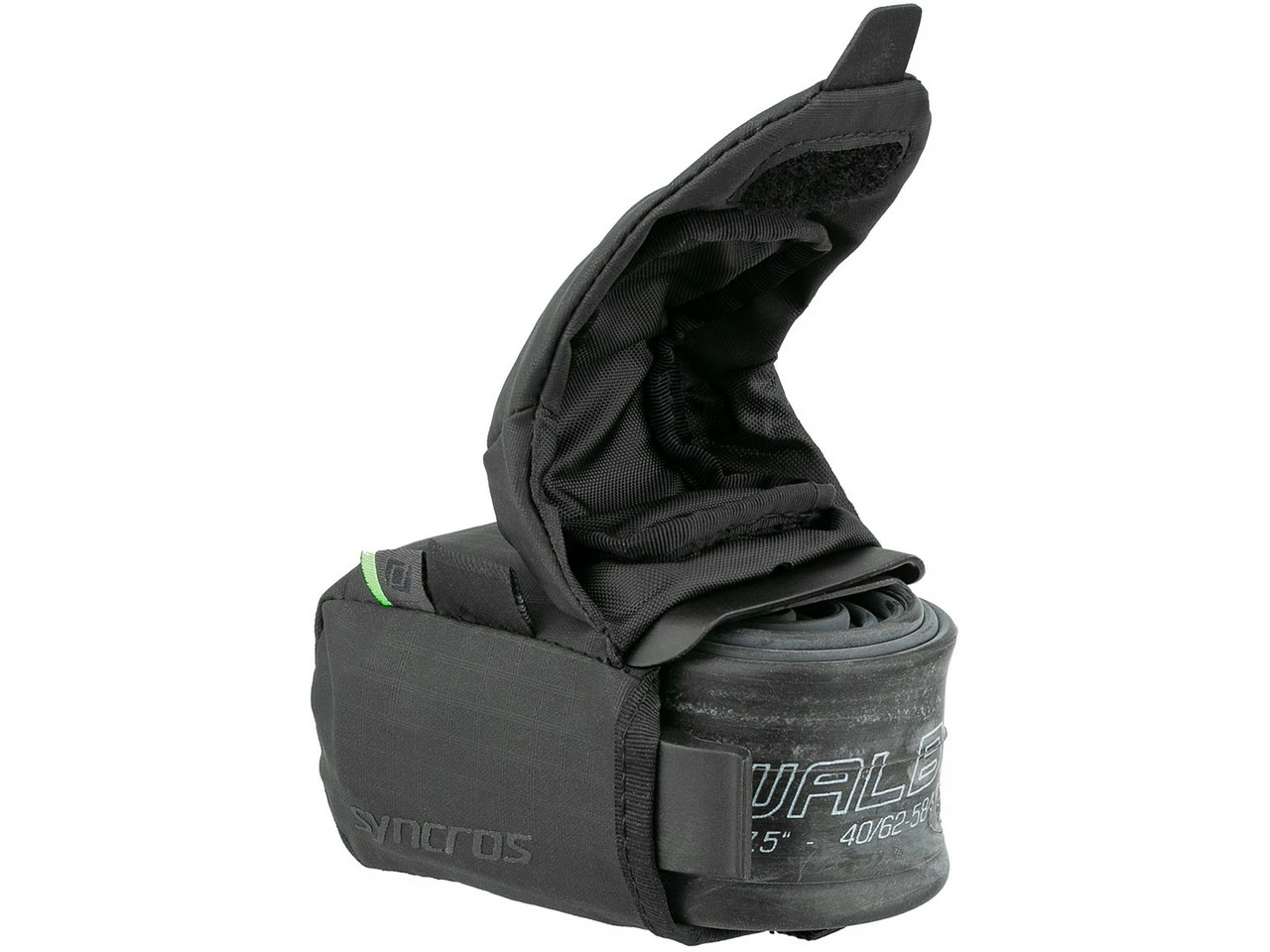 Die integrierte Satteltasche ist speziell für den Rennradeinsatz konzipiert, hat Platz für einen Schlauch sowie Reifenheber und passt in die Sattelschienen von Syncros-kompatiblen Sätteln. Dazu wird sie mit zwei Schrauben direkt befestigt.
